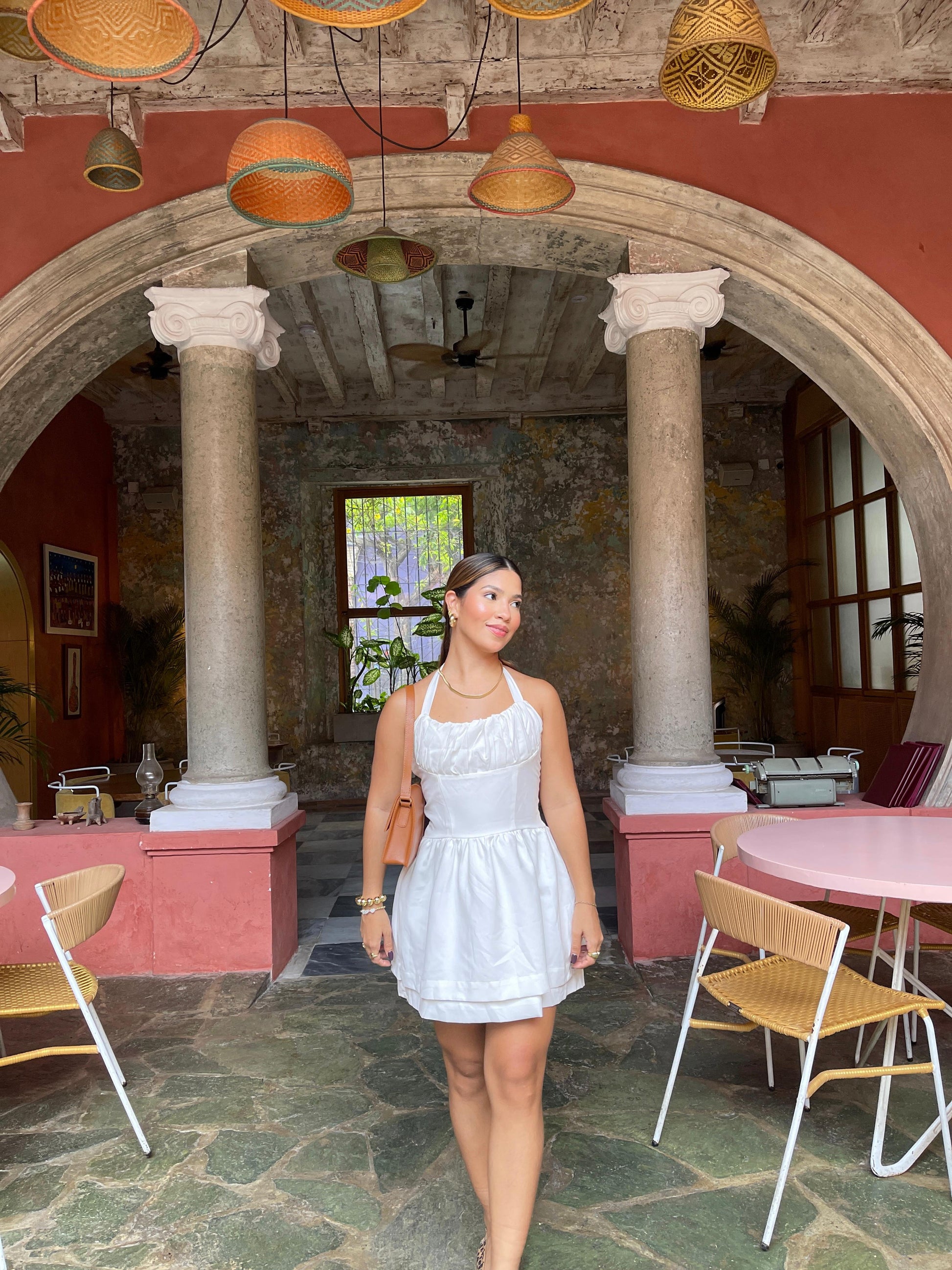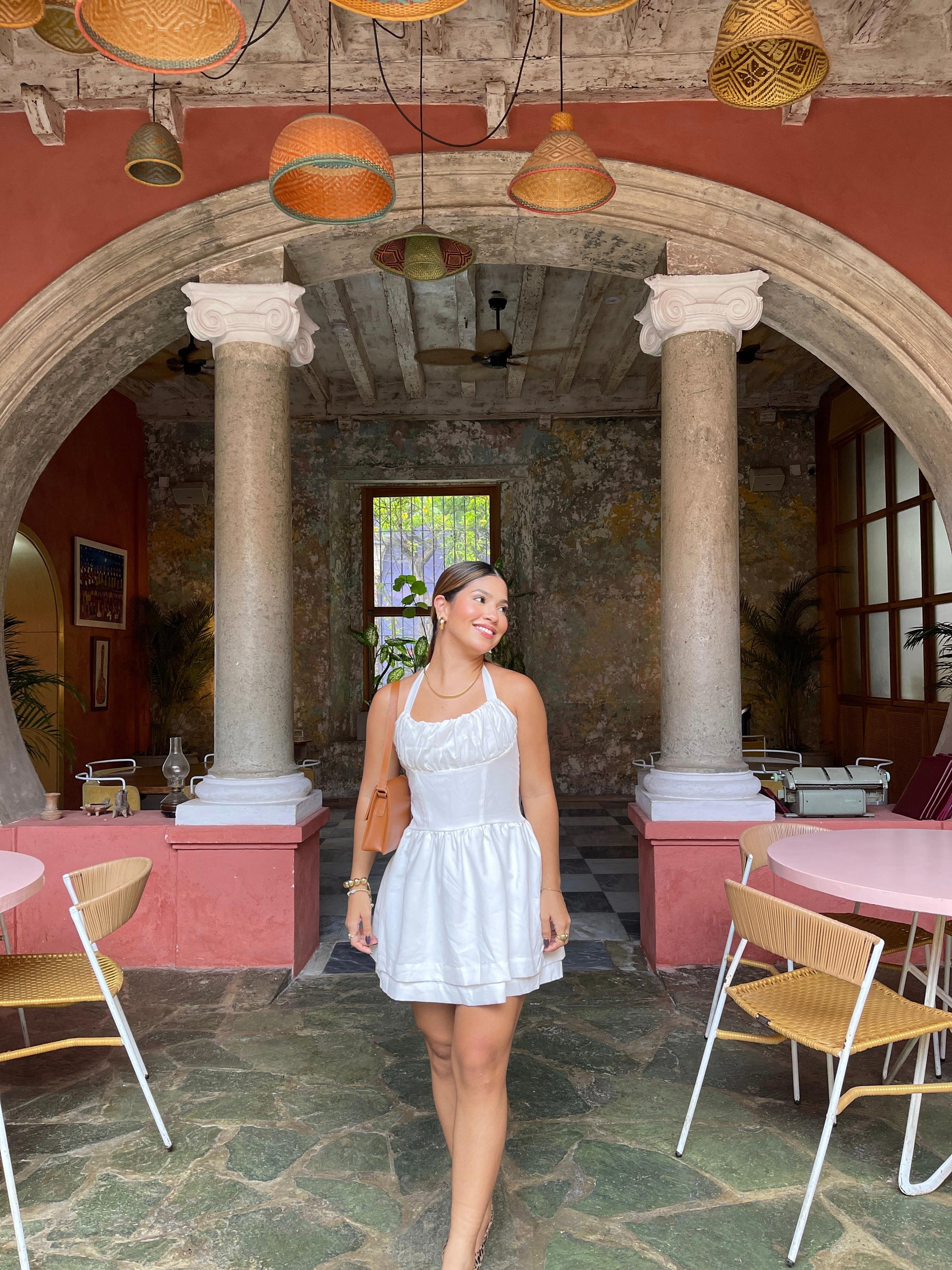 El vestido Elizabeth es sinónimo de elegancia clásica y encanto femenino. Confeccionado en una tela satinada blanca de acabado suave, presenta un escote halter tipo corsé con delicados pliegues que enmarcan el busto, dando soporte y forma. Su falda de corte en A y caída natural aporta movimiento y comodidad, mientras su ajuste en la cintura realza la silueta con sutil sofisticación.