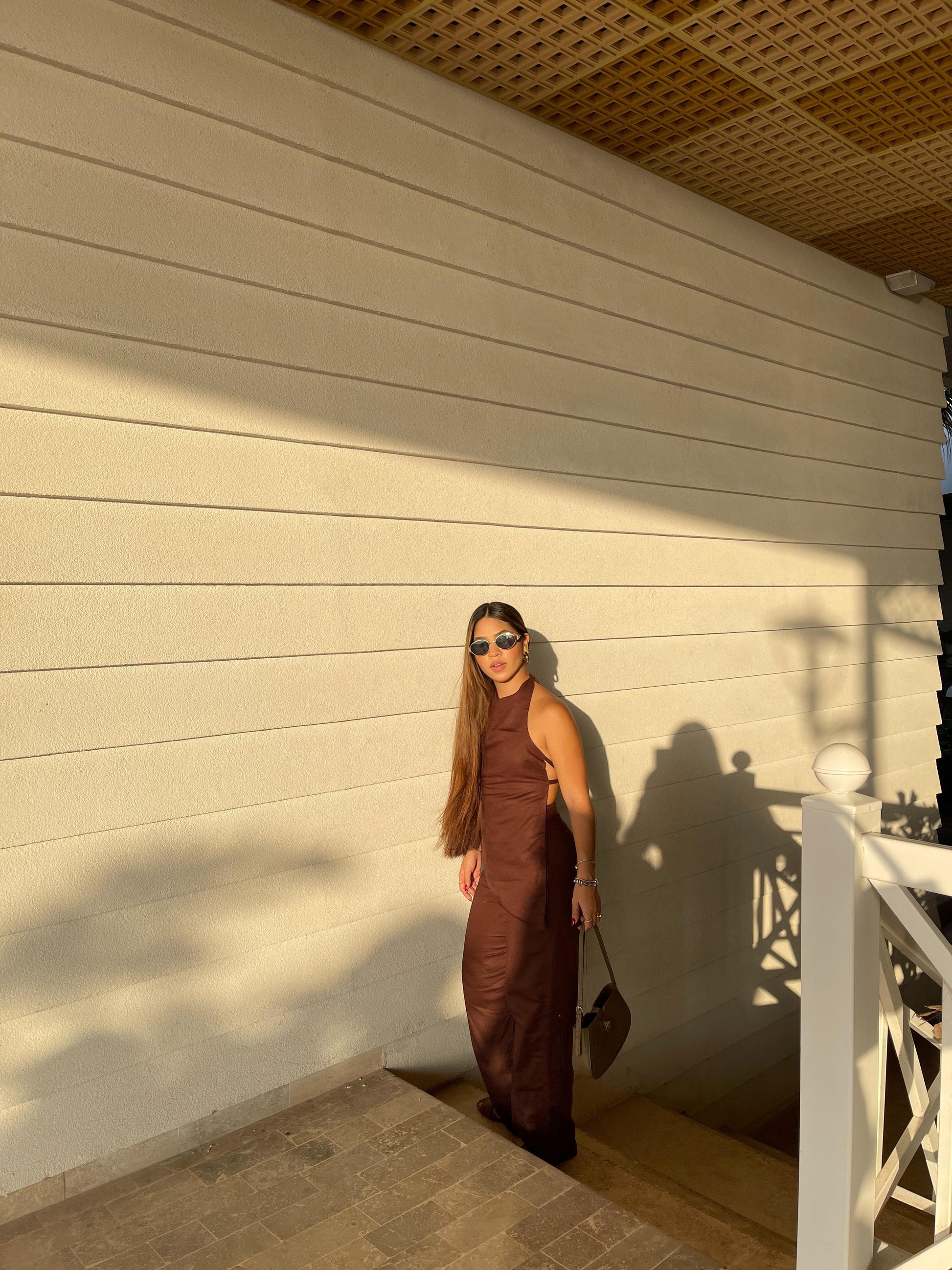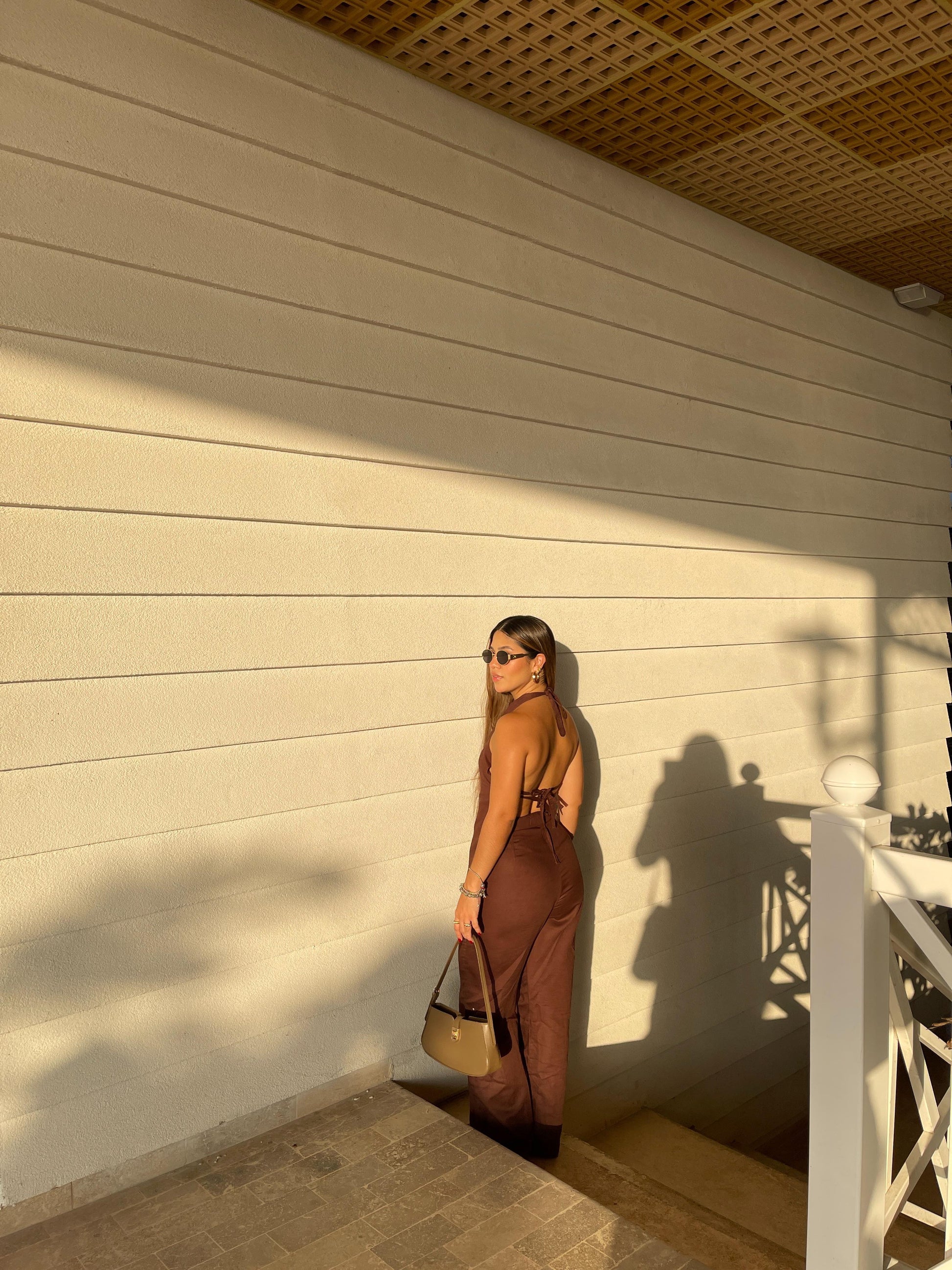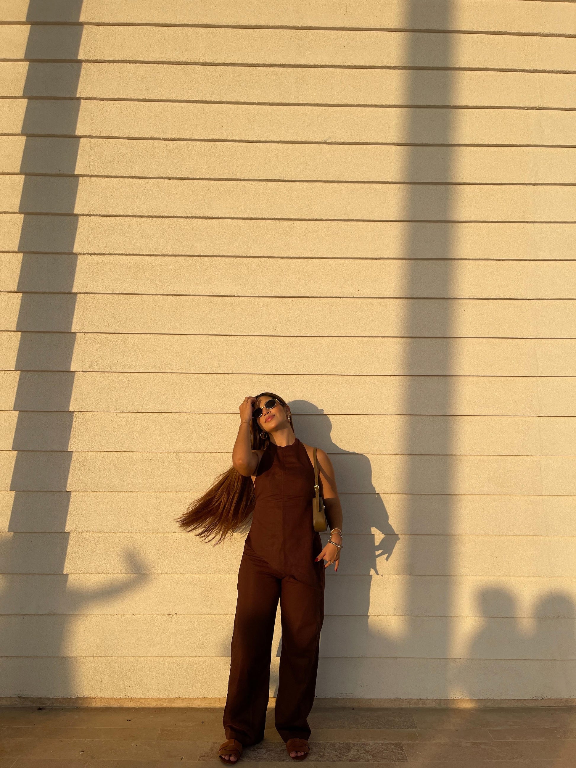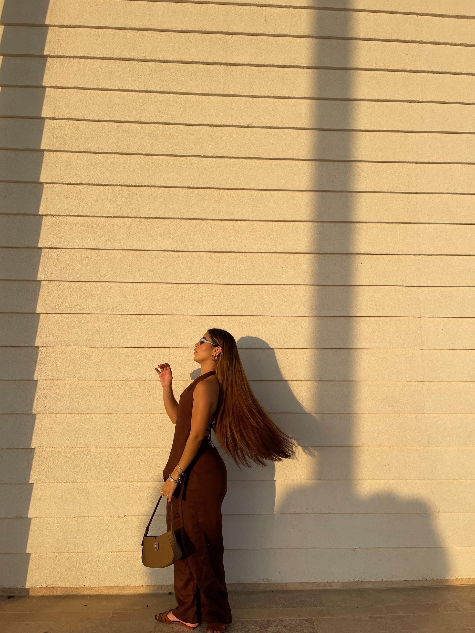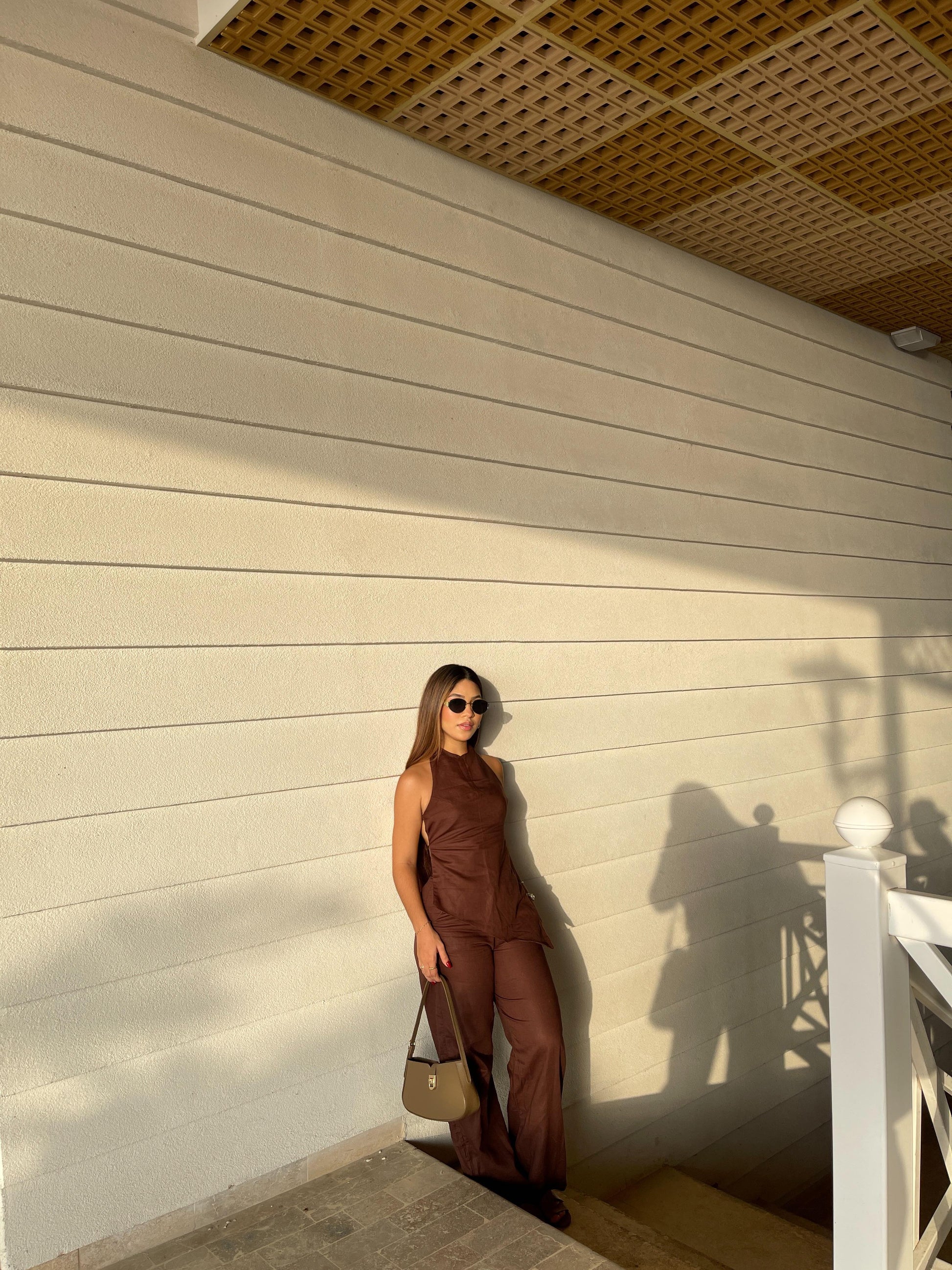 Déjate envolver por la elegancia cálida del conjunto Arabella, una propuesta sofisticada y versátil que combina modernidad y confort. Confeccionado en lino premium color marrón intenso, este set incluye un top halter de caída asimétrica y pantalón palazzo de tiro alto que estiliza la figura y brinda libertad de movimiento. Su diseño minimalista con detalles cuidados lo convierte en la elección perfecta para atardeceres en la ciudad o escapadas al Caribe.