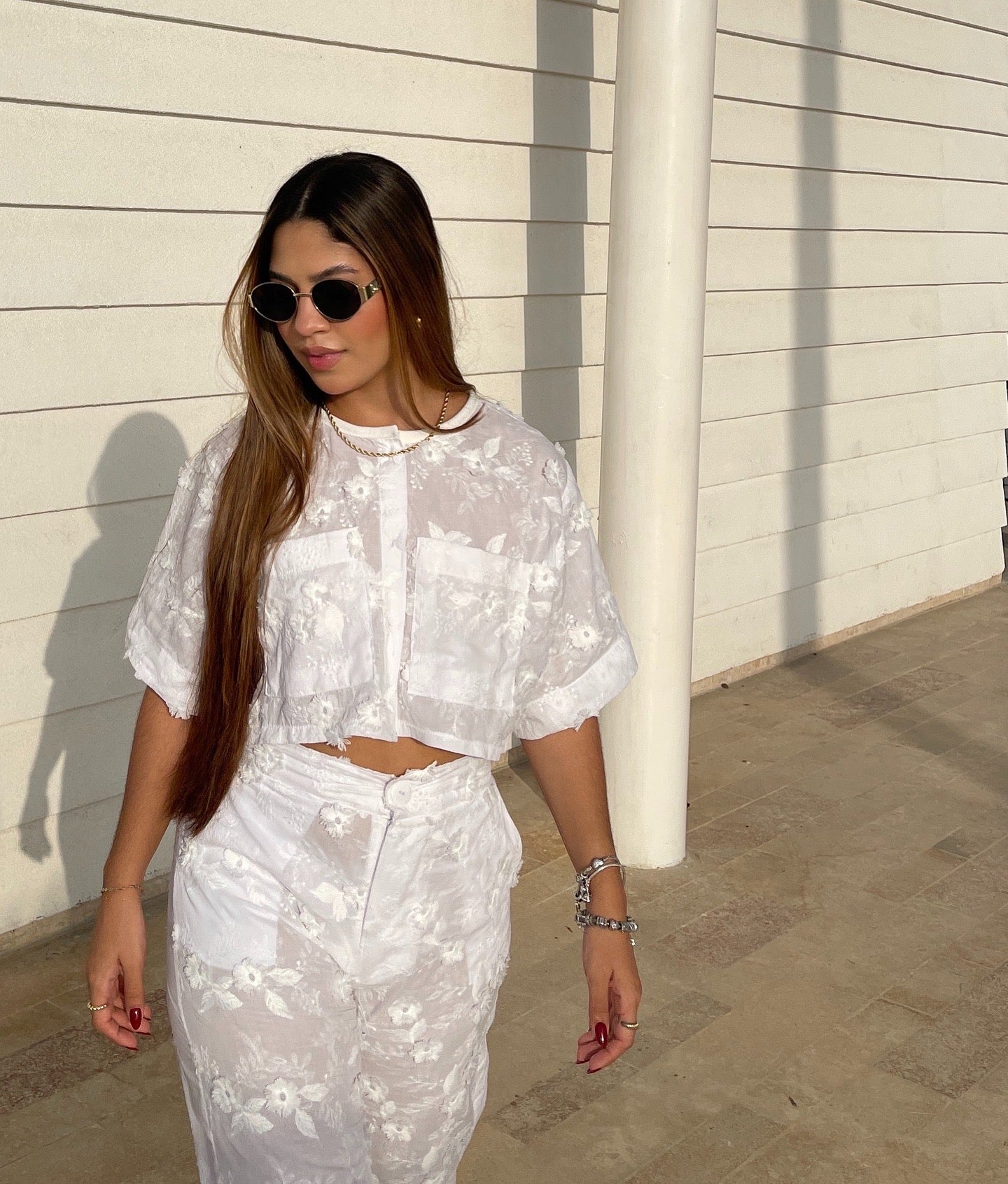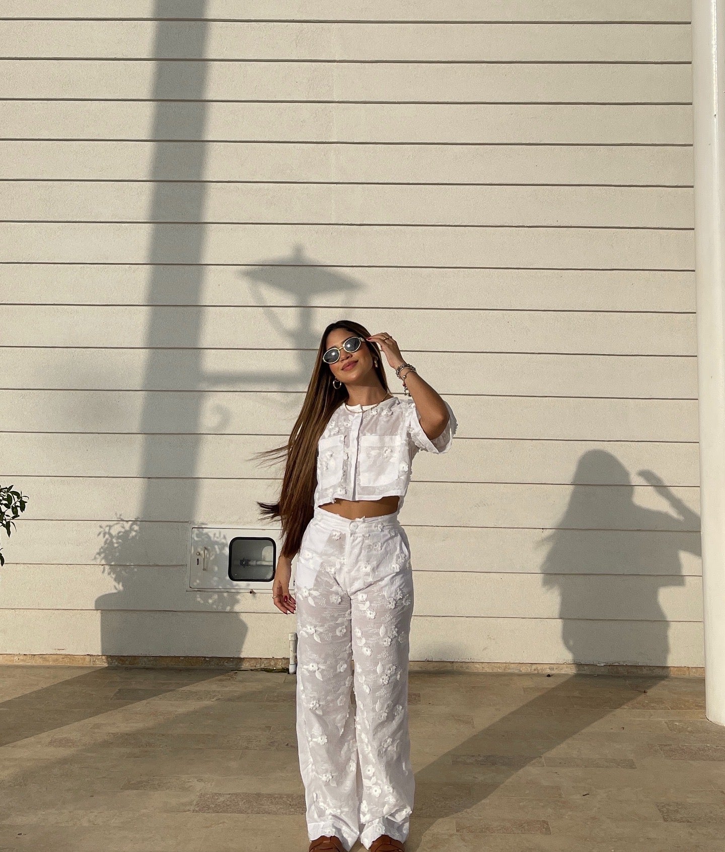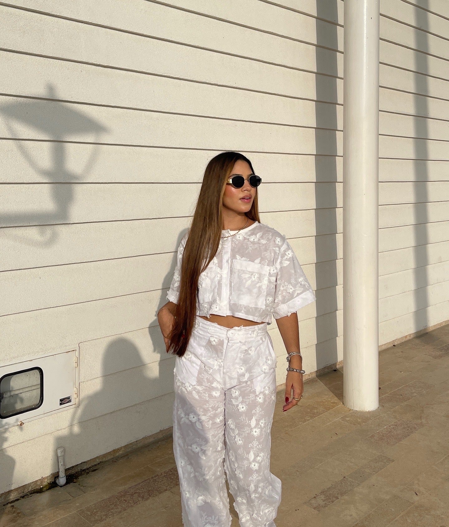El Set Clara está diseñado para resaltar la frescura y elegancia del verano con un toque bohemio y chic. Confeccionado en ojalillo blanco bordado, este conjunto de camisa tipo crop y pantalón fluido es ligero, sofisticado y perfecto para lucir con estilo bajo el sol. El detalle de transparencias sutiles aporta sensualidad y frescura sin perder la delicadeza.