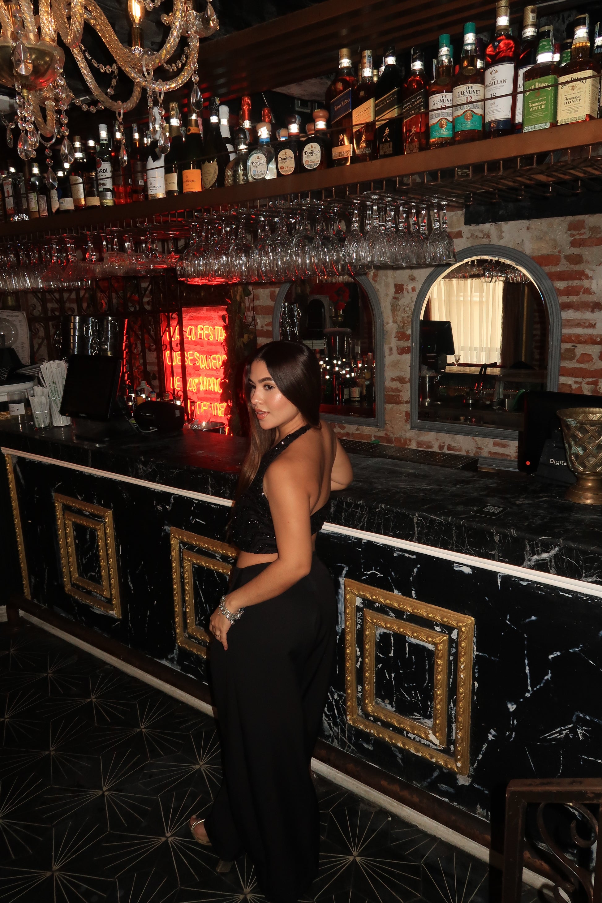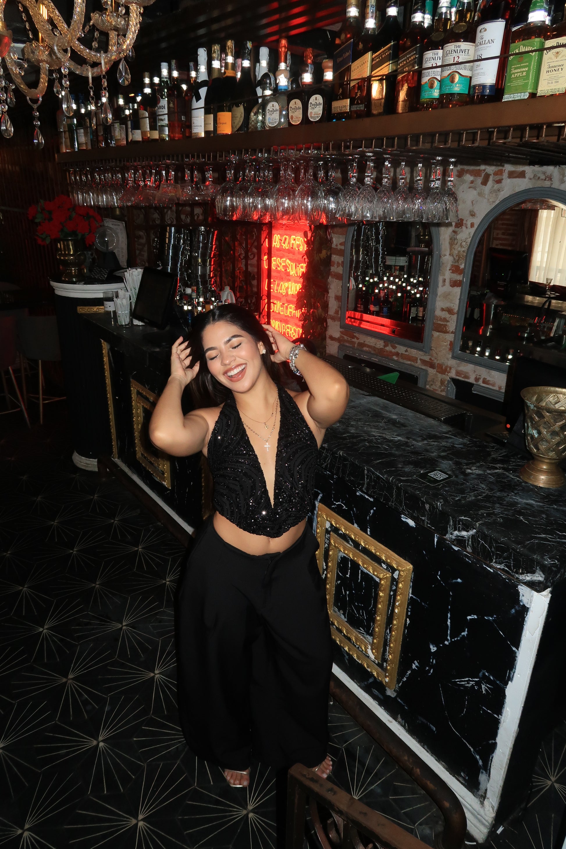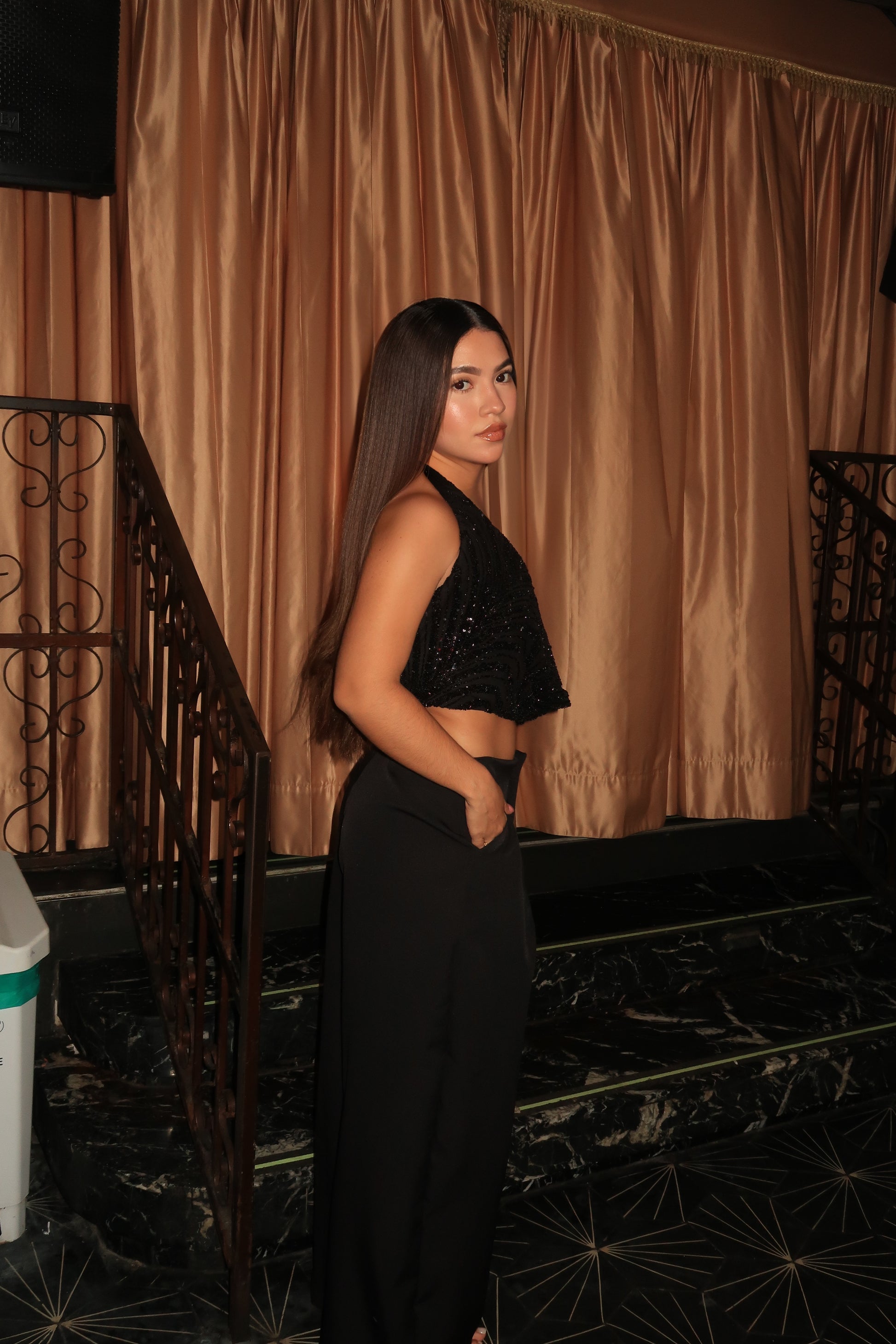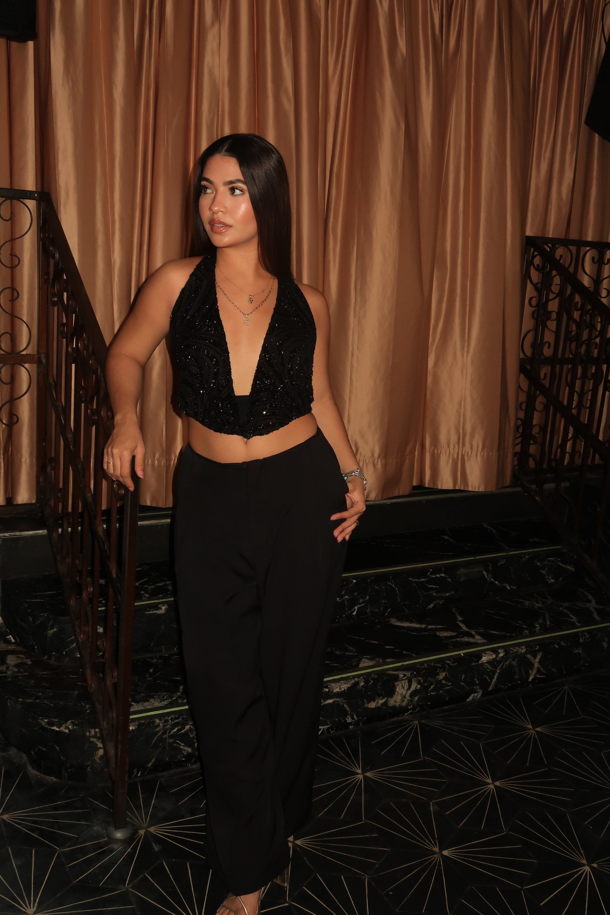 El Set Medianoche combina un top halter con bordados brillantes y un pantalón de silueta recta que aporta elegancia y comodidad. Su diseño en negro profundo captura la esencia de la noche festiva: sofisticación, misterio y un toque de luz en cada detalle.