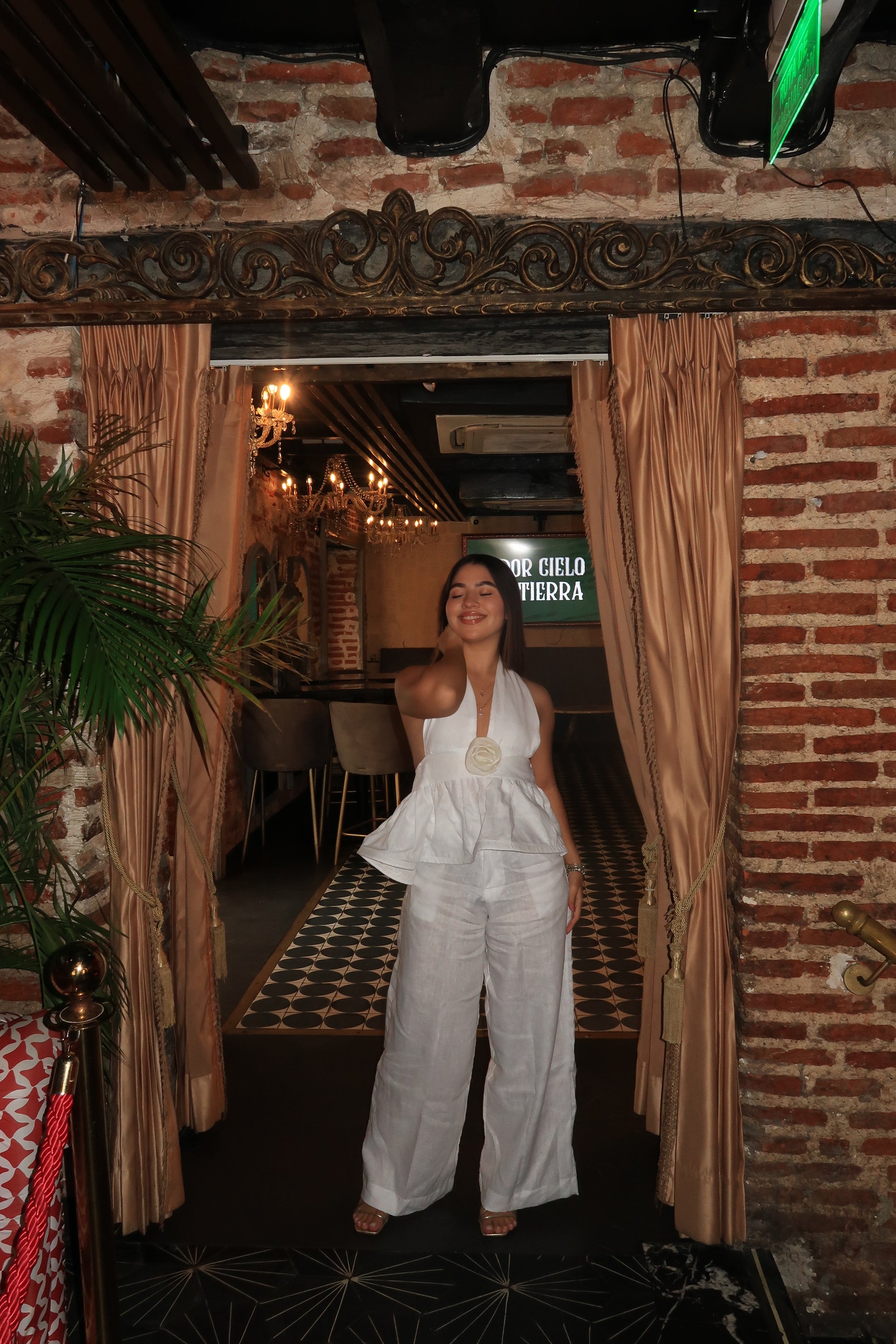 El Set Ofelia destaca por su elegancia ligera y su silueta femenina. Su top halter con detalle central y diseño peplum realza la cintura, mientras que el pantalón fluido aporta comodidad y un movimiento sofisticado.