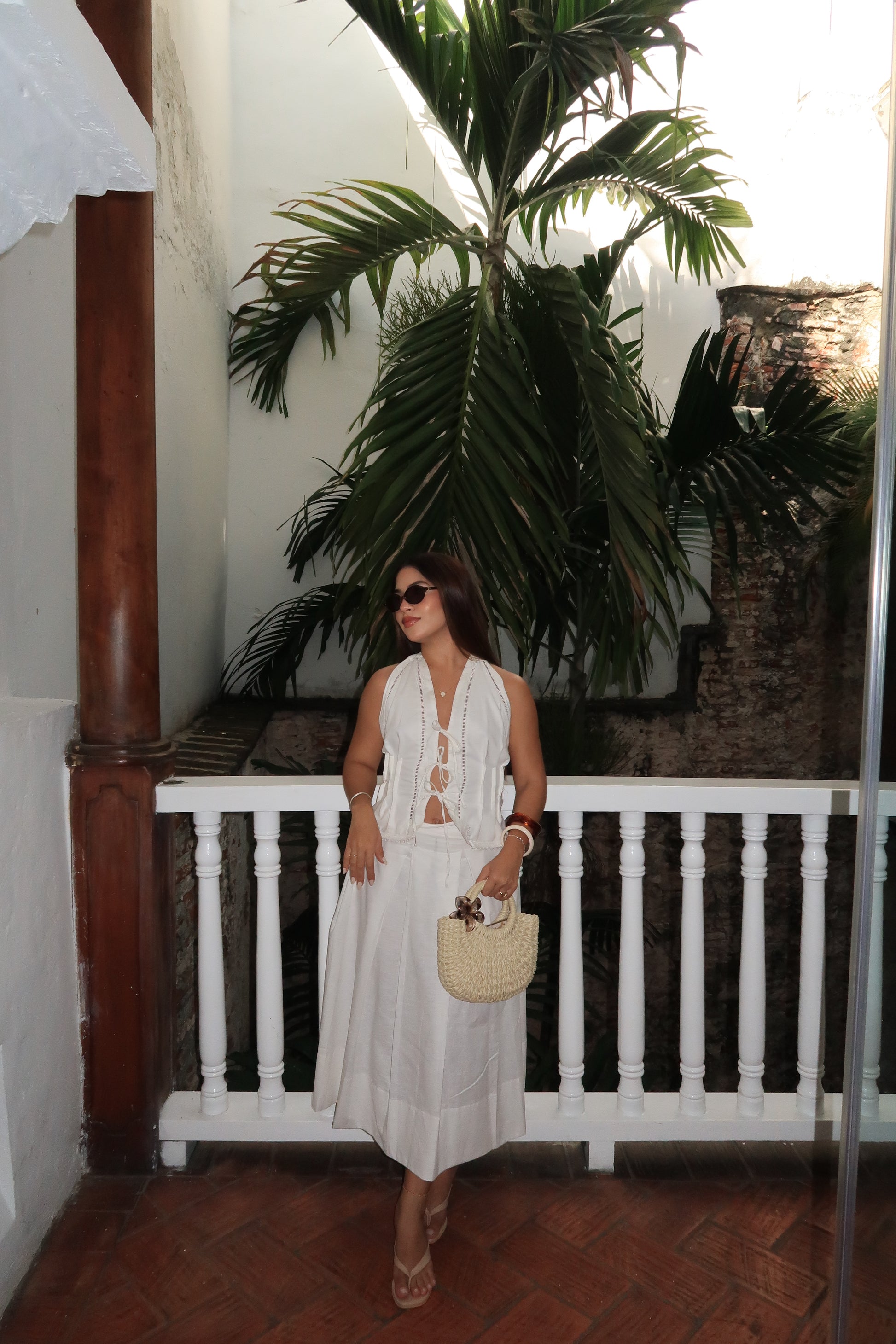 Revelio II es un set de dos piezas en lino ligero: un top con detalles de amarres al frente que permite ajustar la silueta a tu gusto y una falda midi de corte fluido que aporta movimiento y frescura.